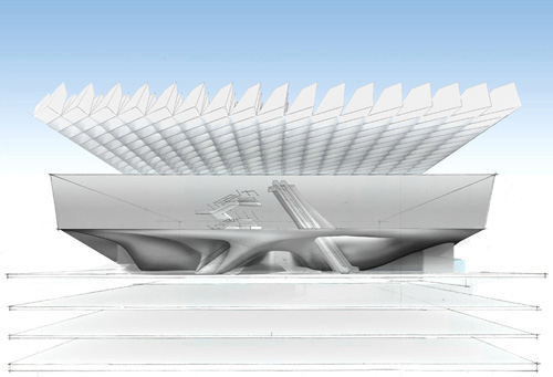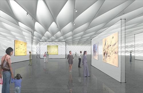 ورودی عمومی اصلی از بزرگ راه توسط یک اسانسور که در پوسته ی ساختمان قرار گرفته است به موزه متصل میگردد.مجموعه ی پایه ای شفاف که کاملا از لعاب پوشانده شده در تضاد با توده ای غیر شفاف برای فضای بایگانی و ذخیره سازی نهاد شده است.برخلاف طراحی موزه سنتی، غالب نقش جدید در تجربیات بازدیدکنندگان نقش مهمی ایفا میکند.نیمه معلق در هوا در ساختمان که از سطح زیرین فرم ساختمان در قسمت لابی بریده شده است در حالی که از طبقه فوقانی ان به عنوان فضای نمایشگاهی استفاده می شود. فیلترهای طبیعی در روز اجازه میدهند که نور به فضای نمایشگاه طبقه بالا و سه طبقه دیگر که توسط پرده ای با ساختار سلولی اسکلت خارجی اطراف موزه را پوشانده است بتابد .علاوه بر این تقریبا یک هکتار از فضا به گالری با ستون ها ی ازاد همچنین یک سالن با گنجایش 200 نفر برای برگذاری سمینار در موزه و در طبقه اول یک گالری چند رسانه ای و یک لابی عمومی همراه با یک فضای نمایشی و یک فروشگاه برای موزه ، اختصاص داده شده است.