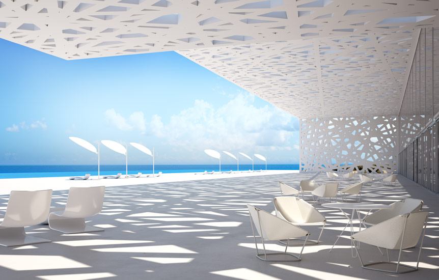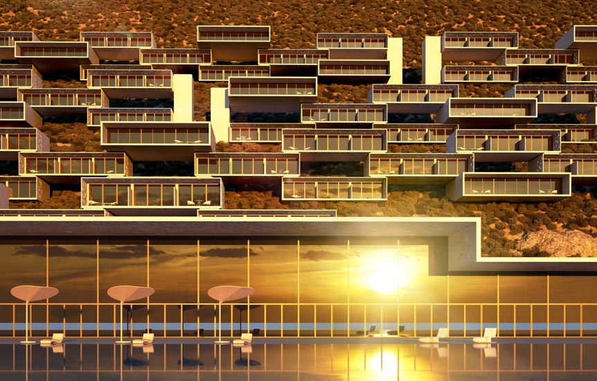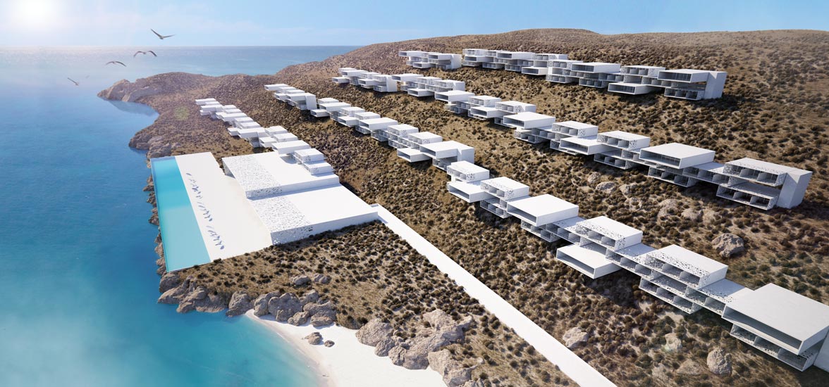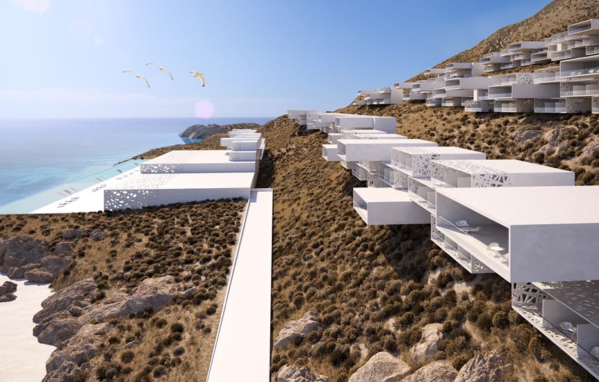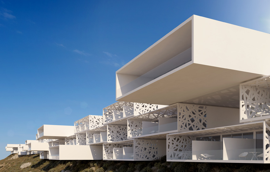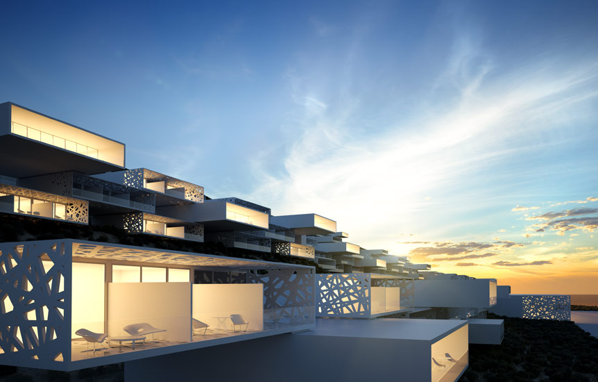 این طرح از چندین واحد در سه خط موازی و به صورت ریتمیک تشکیل شده است. این سه خط روی دامنه ی شیب قرار گرفته که این اختلاف ارتفاع موجود بین سه لایه باعث شده تا همه ی واحد ها بر چشم انداز دریا مشرف باشند. همانطور که در تصاویر می بینید، فرم این واحد ها به صورت باکس هایی می باشد که روی هم قرار گرفته اند و هر واحد دارای تراس های وسیعی می باشد. طراحان به منظور جلوگیری از نمای سلب و ساده ی احجام، از حفره هایی با اشکال هندسی نامتقارن استفاده کرده اند تا ظاهری متفاوت به نمای ساختمان ها بخشند. در واقع با مشاهده ی این احجام سفید روی دامنه ی شیب، شاهد نوعی نظم و هماهنگی یکپارچه ای در سطح چشم انداز می باشیم.