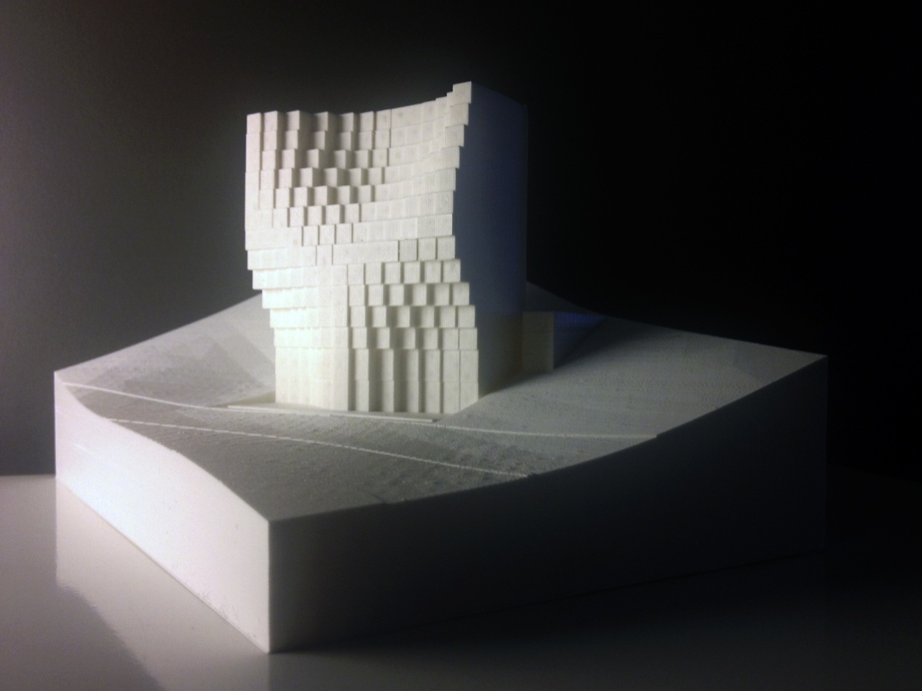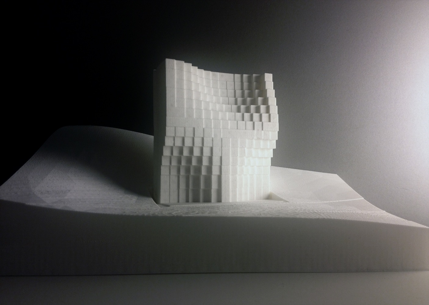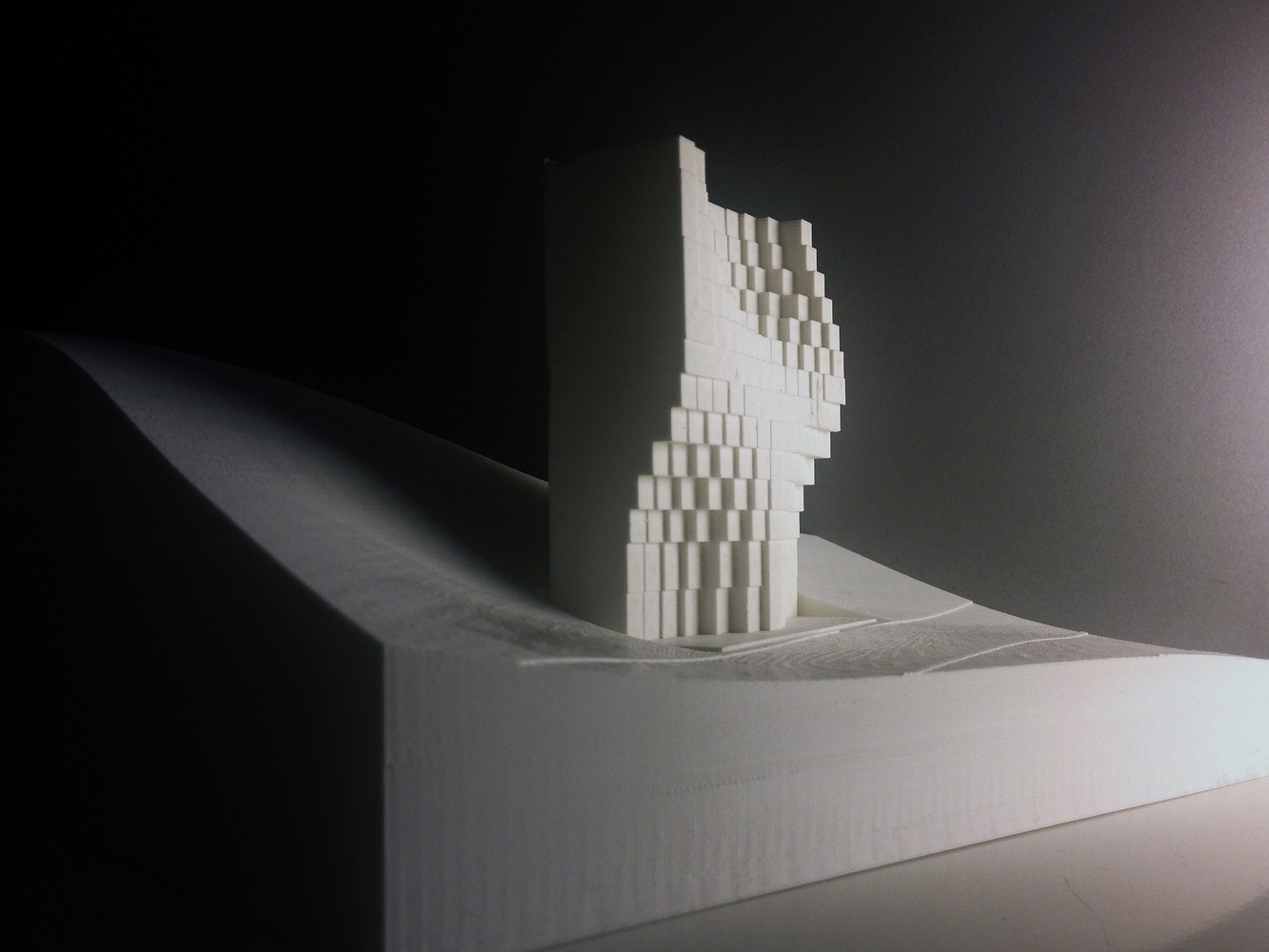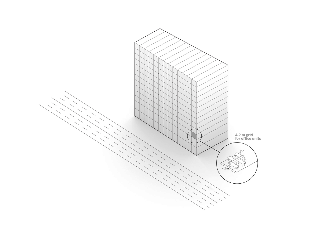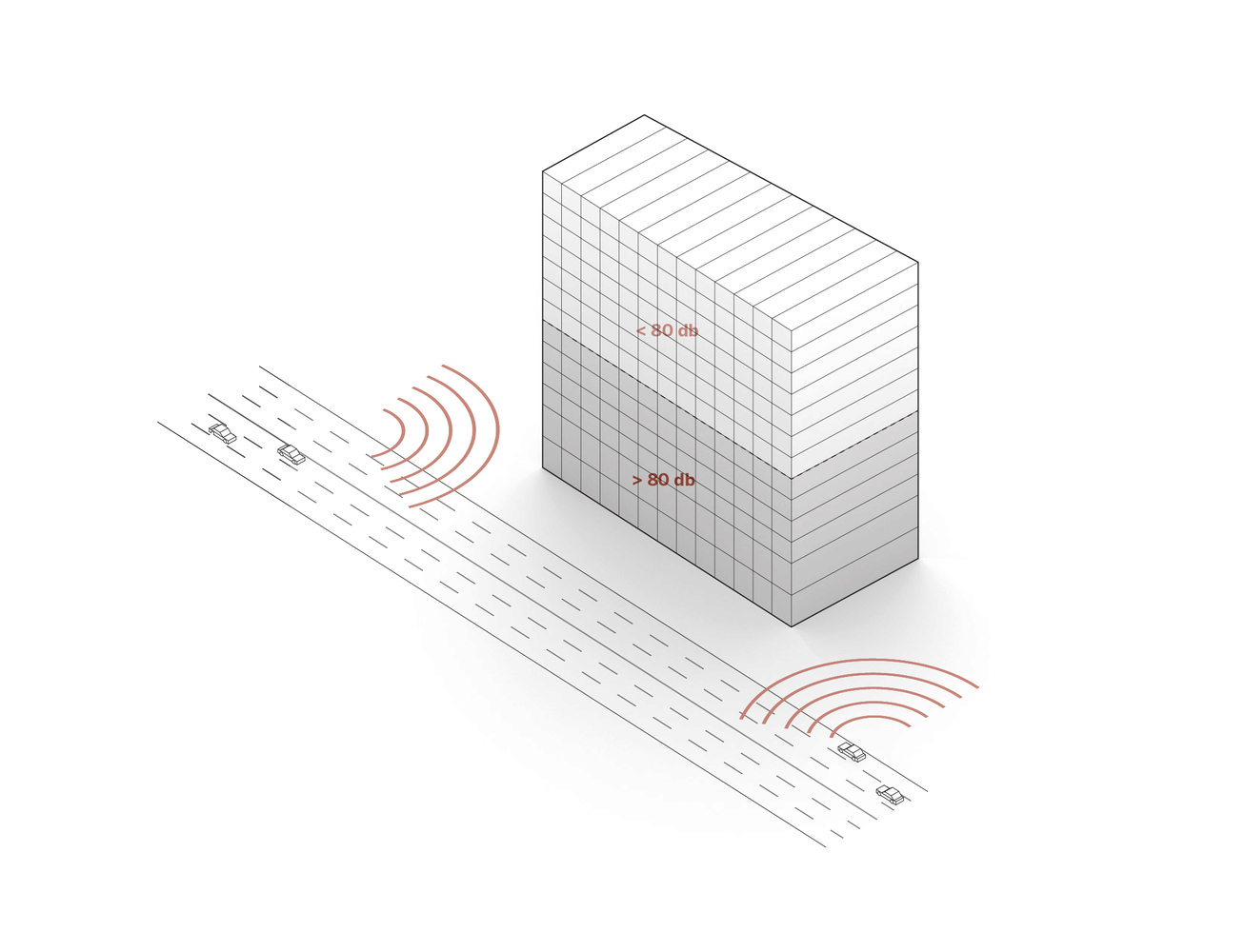 احجام پیش آمده و عقب نشینی شده بنا علاوه بر کاهش صدا، به عنوان سایه بانی برای دیوار کناری خود مورد استفاده قرار می گیرند. توضیح زیادی درباره جایگذاری و طرح نهایی نما ارائه نشده اما با مشاهده رندر ها می توان نتیجه گرفت که هر طبقه و هر عرصه توسط مکانیزم مکانیکی قابلیت جایجایی داشته و کاربندی نما و پوسته منجر به ایجاد تراس های زیبا و مناسبی برای این ساختمان تجاری، اداری شده است.